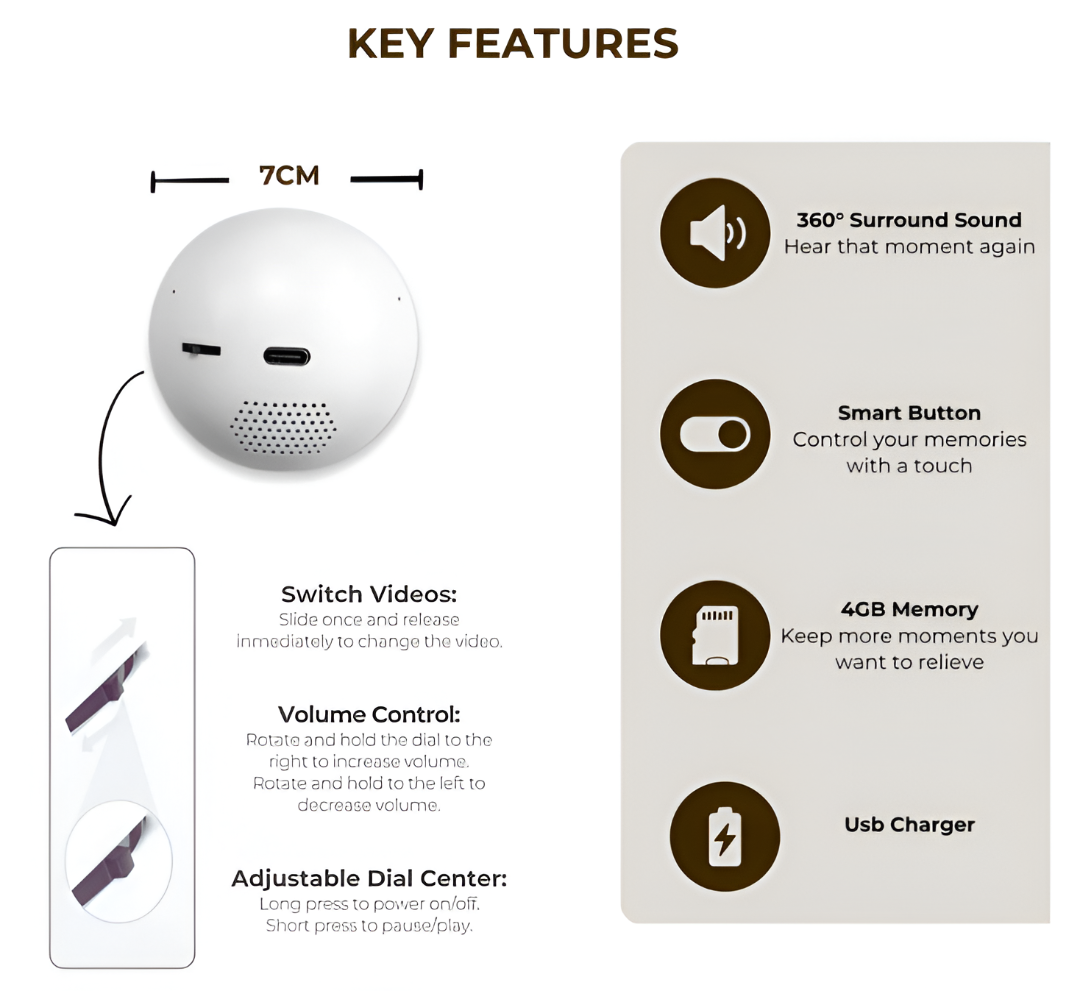 Easily switch videos, control volume, and enjoy 360° sound with a single touch. Includes 4GB memory, USB charging, and a smart button to relive every momen