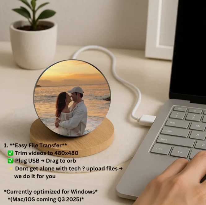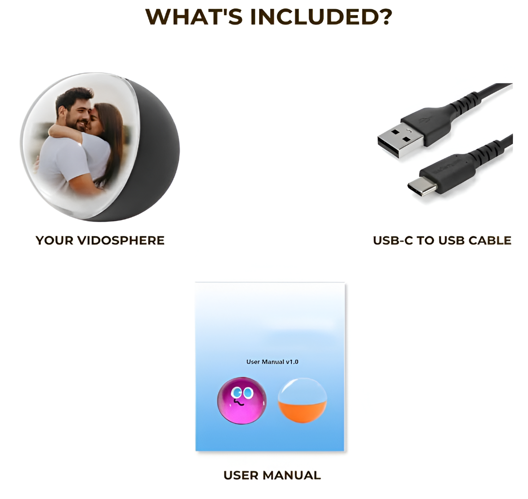 Your MemoriGlass comes with everything you need: the customizable sphere, a USB-C to USB charging cable, and a user manual to guide you step-by-step